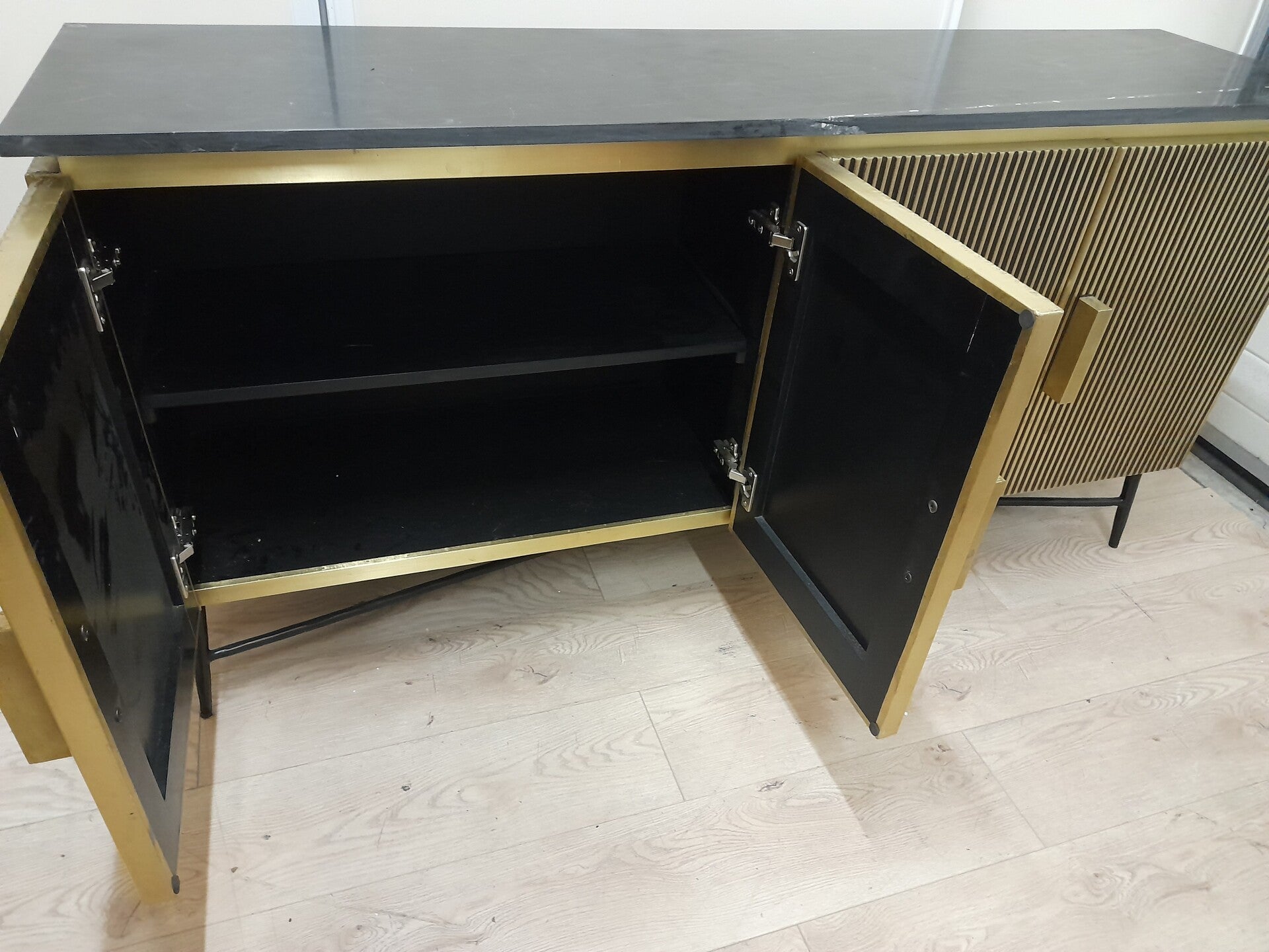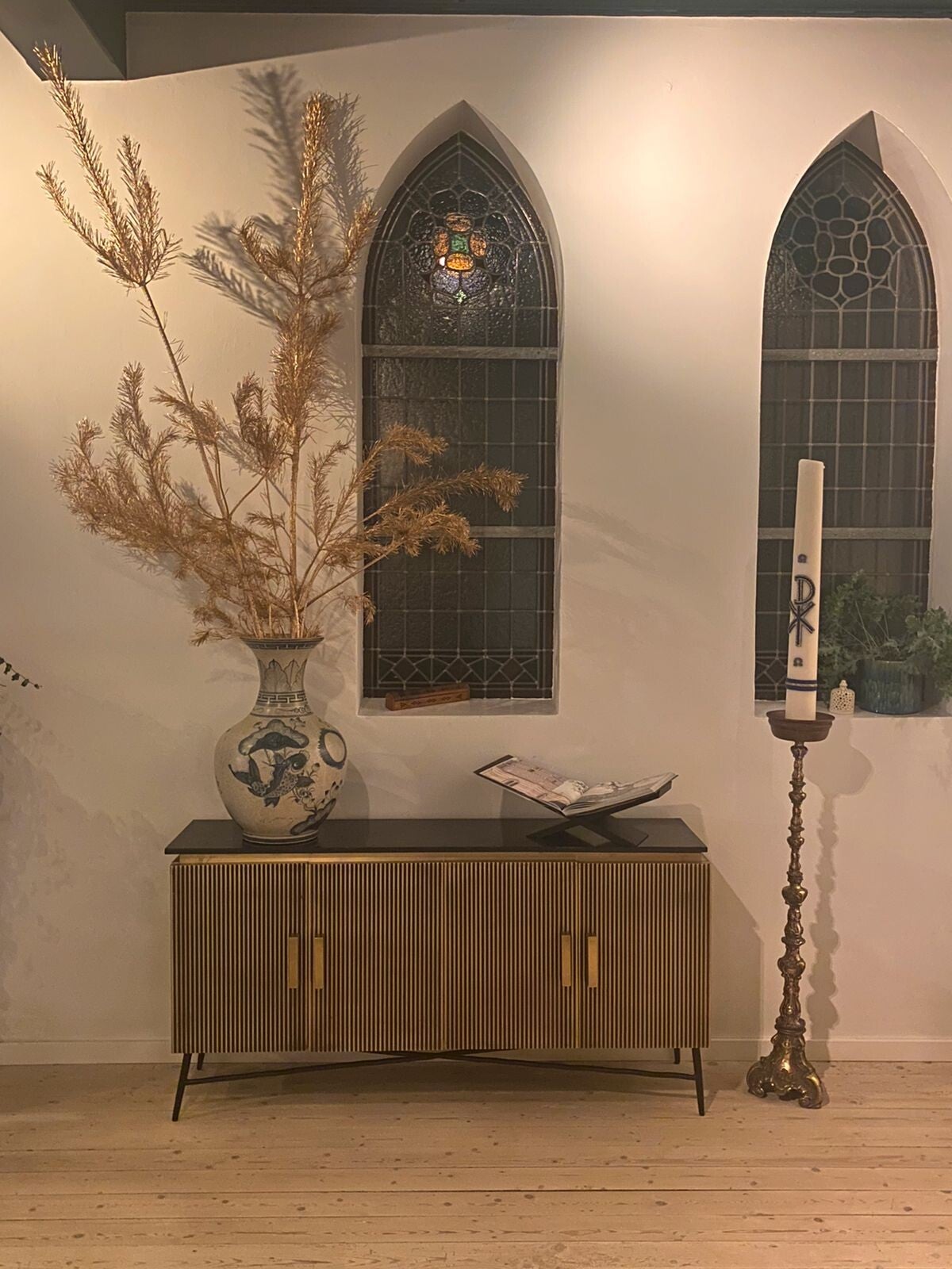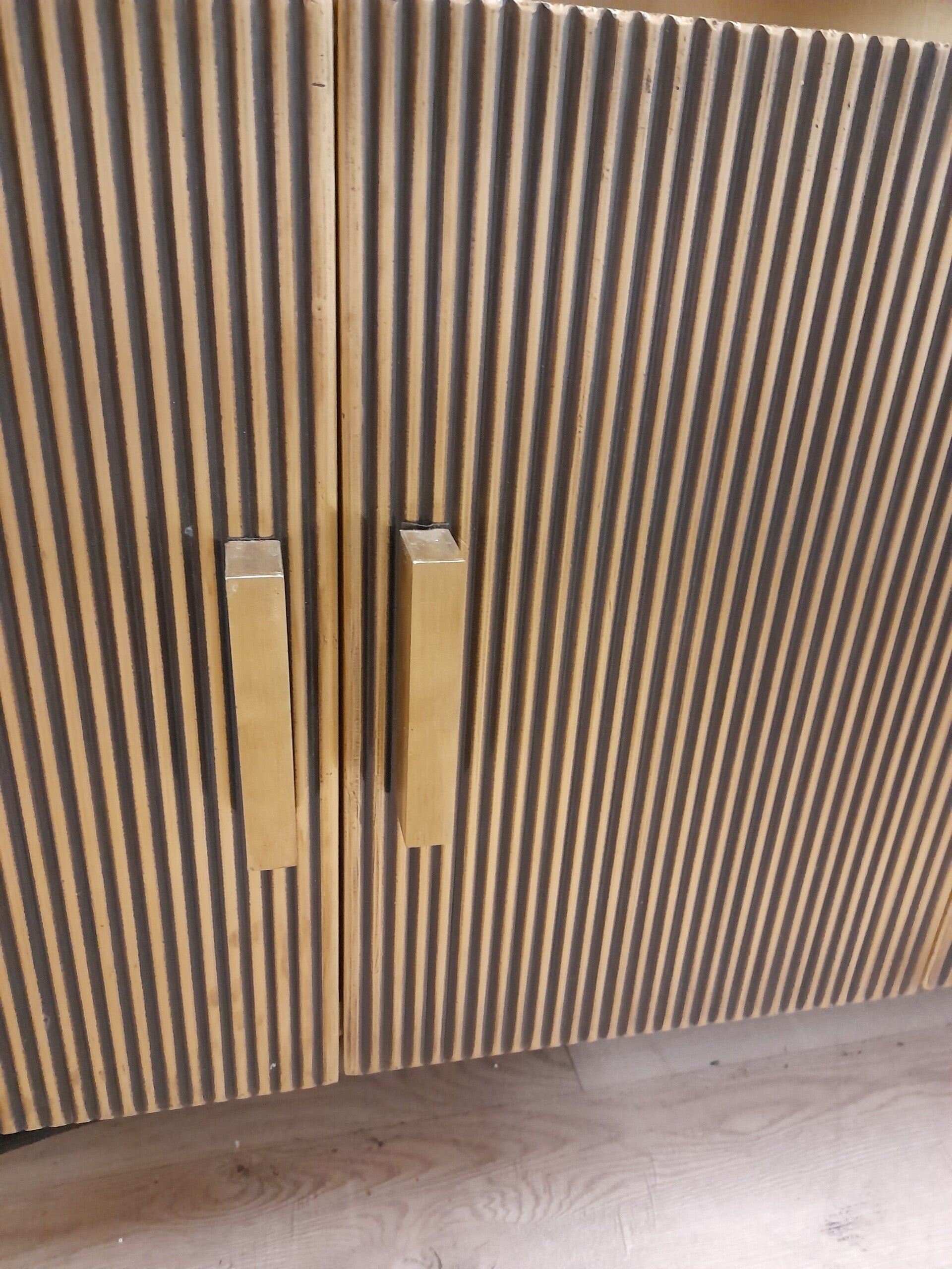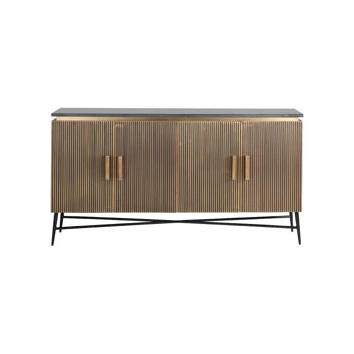 Het dressoir heeft een strakke vorm gecombineerd met een ribbelmotief in een gouden messingkleur afgewerkt met zwarte tinten.